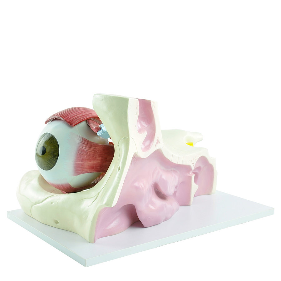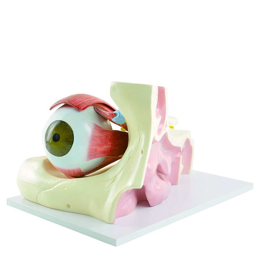 Dieses Augenmodell von HeineScientific zeigt das menschliche Auge und sämtliche umliegenden Strukturen in ca. 6-facher Vergrößerung. Sehnerv, Augenmuskeln und die knöcherne Augenhöhle sind gut zu erkennen. Das Augenmodell ist fest auf einen weißen Holzsockel montiert.