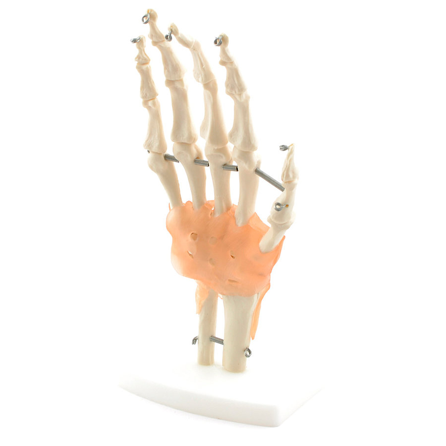 Das bewegliche Hand-Skelettmodell ist flexibel montiert und mit einem Stativ auf einem weißen Sockel befestigt.