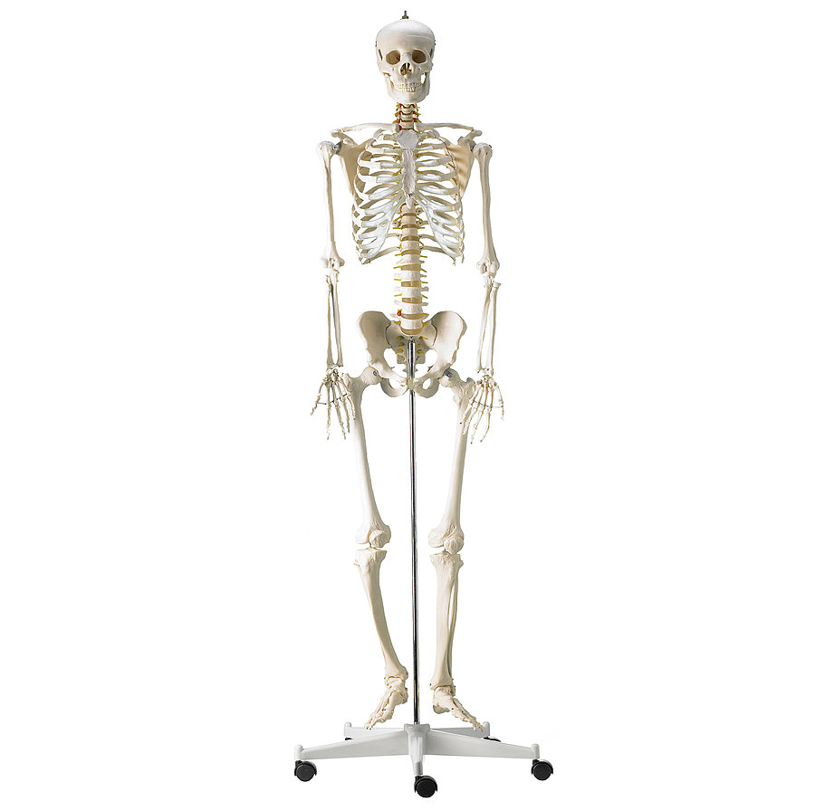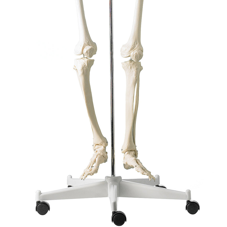 Das mit 180 cm lebensgroße Skelettmodell von HeineScientific gibt den menschlichen Knochenbau originalgetreu wieder. Die Knochen bei diesem Skelettmodell bestehen aus Kunststoff. Zum besseren Transport ist das Skelettmodell auf einem kippsicheren und fahrbaren Stativ befestigt.