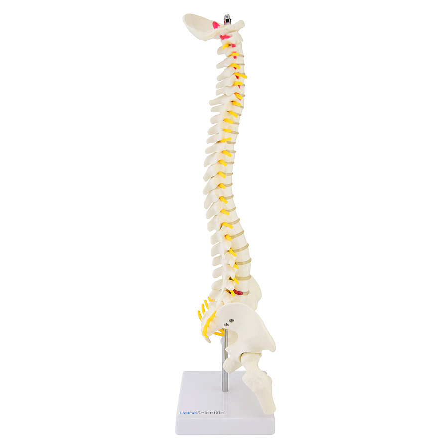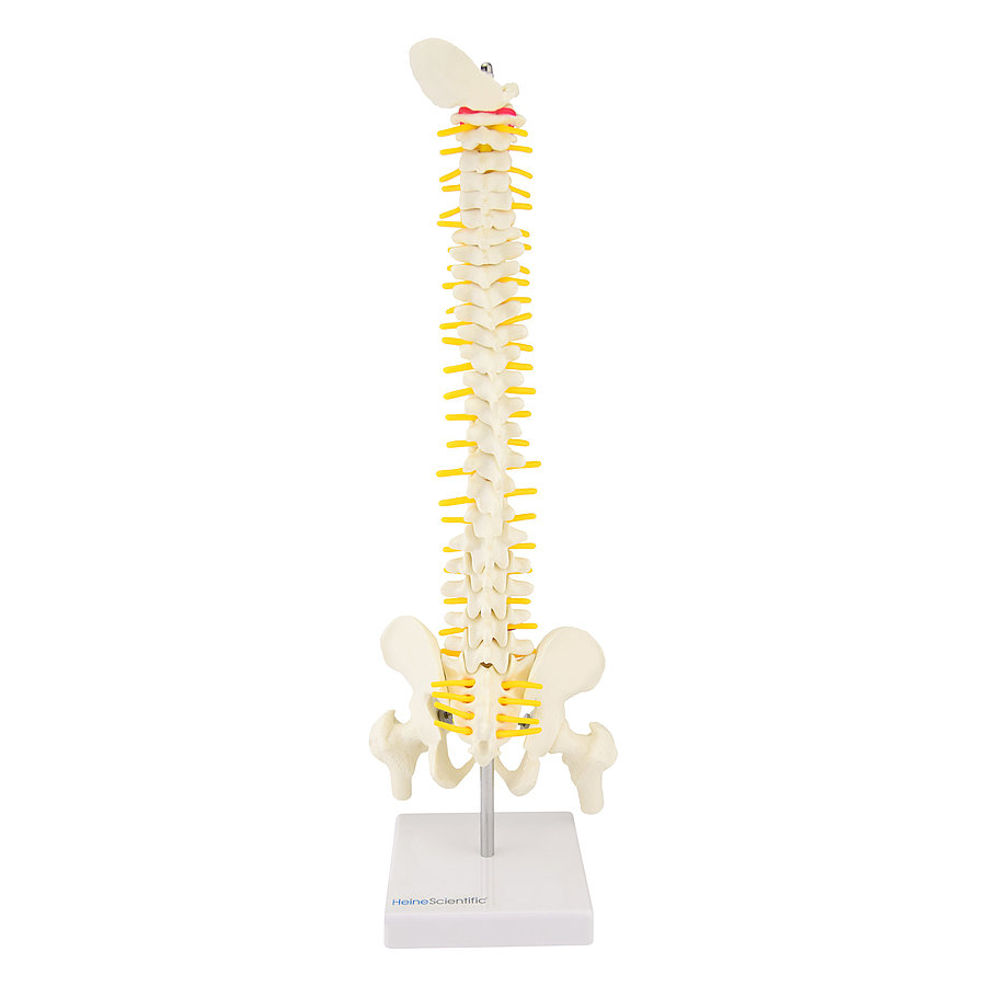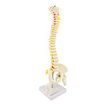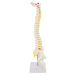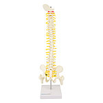 Anatomisches Modell der Wirbelsäule in halber Lebensgröße mit zusätzlicher Darstellung von Schädelbasis und Oberschenkelstümpfen.
