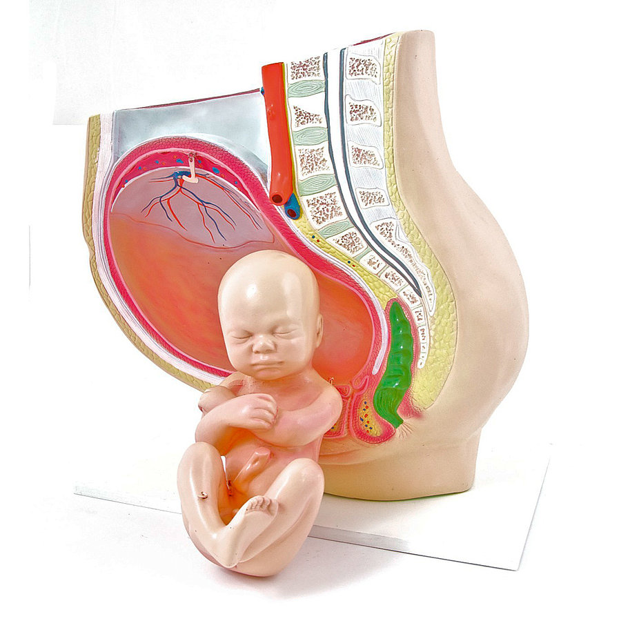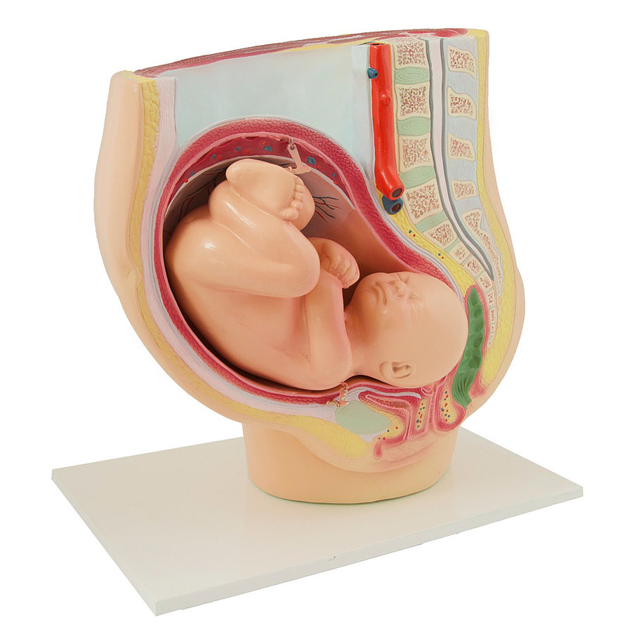 Das Schwangerschaftsmodell von HeineScientific zeigt den weiblichen Unterleib mit einem Fötus kurz vor der Geburt. Das detaillierte und hochwertige Modell ist lebensgroß, der Fötus kann entnommen werden.