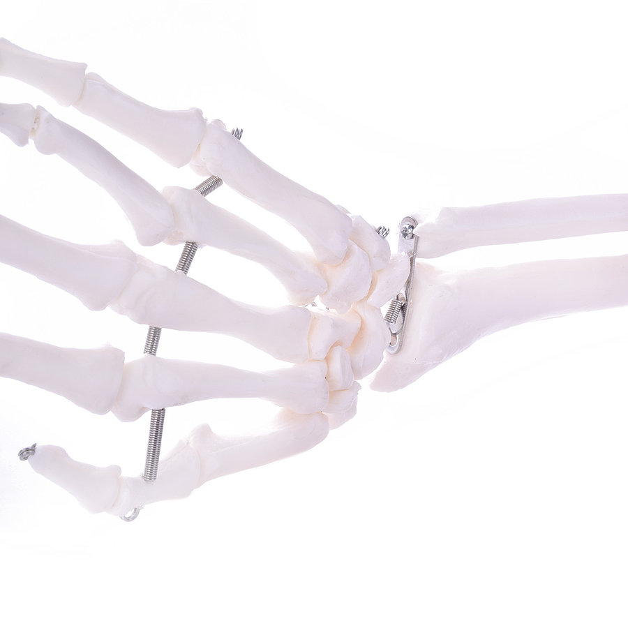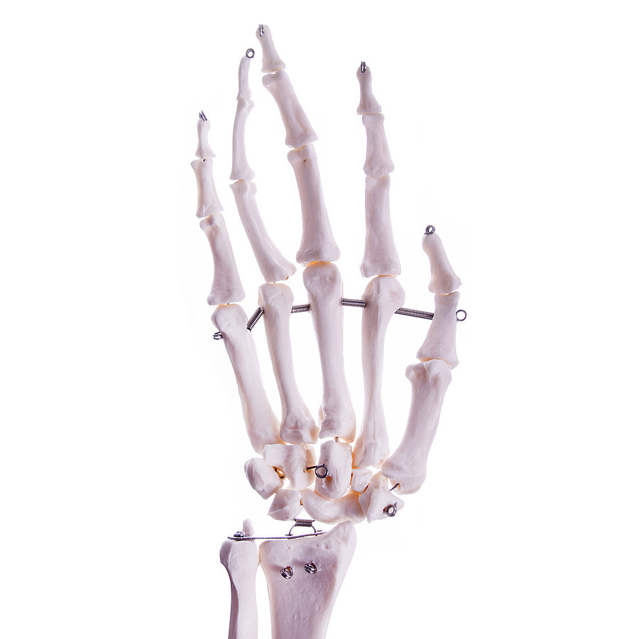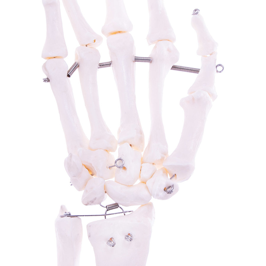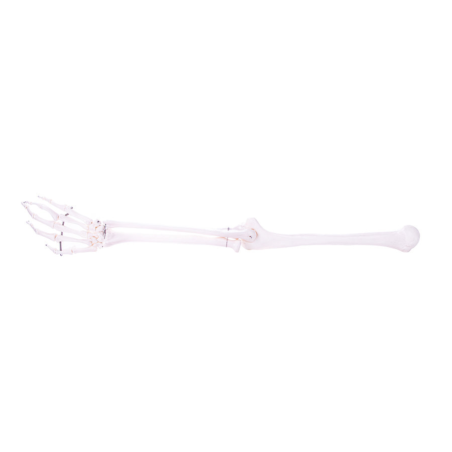 Das Skelettmodell eines menschlichen Arms zeigt den knöchernen Aufbau von Hand, Unter- und Oberarm. Es handelt sich um ein nicht zerlegbares anatomsiches Modell in Lebensgröße.