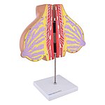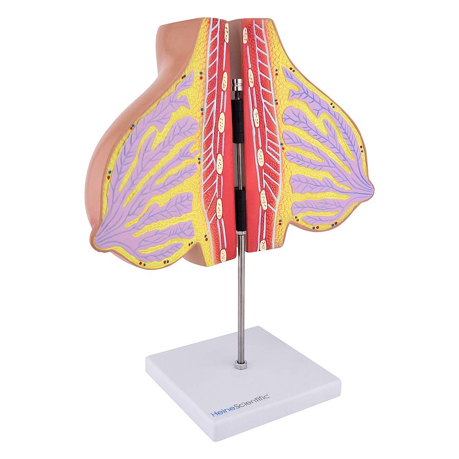 Dieses Modell zeigt die inneren und äußerlichen Veränderungen, die das Stillen bei der weiblichen Brust bewirkt. So sind z. B. die vergrößerten Drüsenkörper sehr gut erkennbar.
