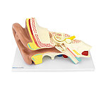 Dieses anatomische Modell zeigt detailliert den Aufbau des Ohrs und den Weg des Schalls von der Ohrmuschel bis hin zum Hörnerv. Die wichtigsten Strukturen im Mittel- und Innenohr lassen sich entnehmen, um genauer betrachtet werden zu können.