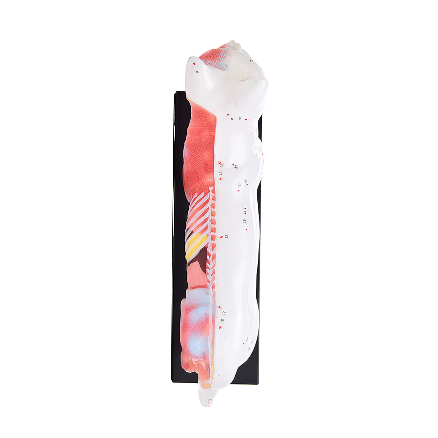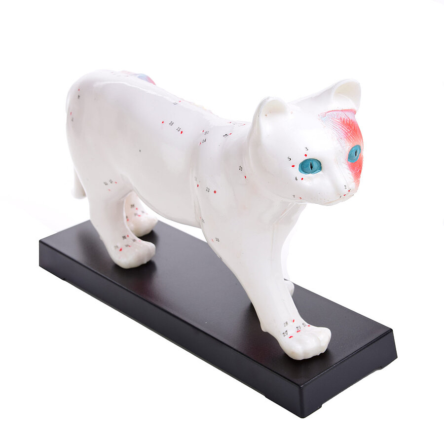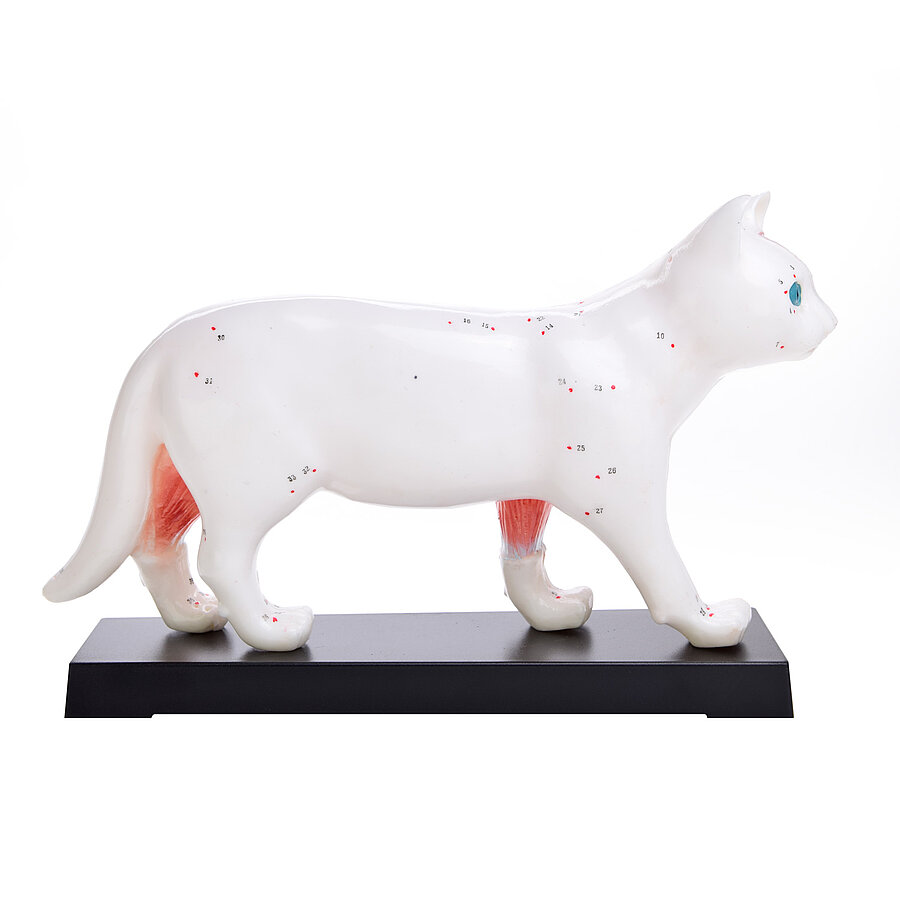 Das Akupunkturmodell Katze ist ein zweigeteiltes Veterinär-Modell, das auf der einen Seite die Haut der Katze mit den wichtigsten Akupunkturpunkten und auf der anderen Seite die Muskulatur, einen Teil der Wirbelsäule und einige Rippen darstellt.