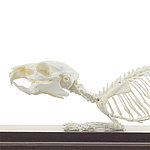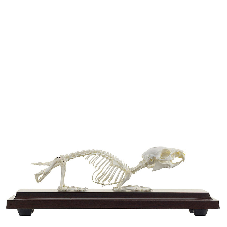 ist besonders detailliert und zeigt den präzisen Skelettaufbau des Nagetieres. Das Skelettmodell ist unbeweglich auf einem Holzsockel montiert und wird zum Schutz mit einer Kunststoffhaube geliefert.