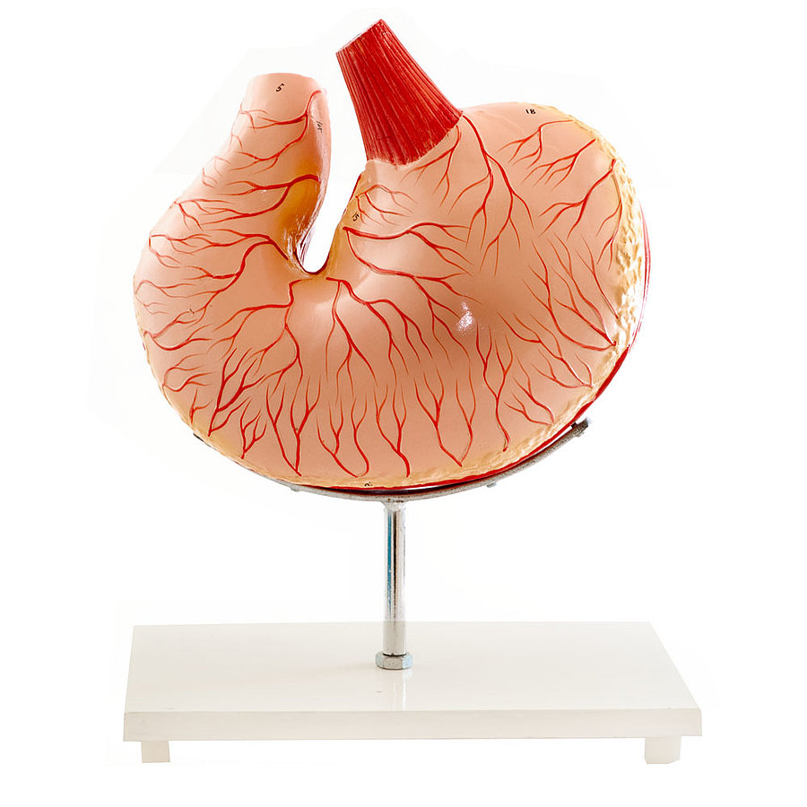 - Das anatomische Modell eines Hunde-Magens ist mit einem Stativ auf einen weißen Sockel montiert