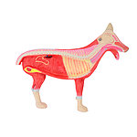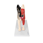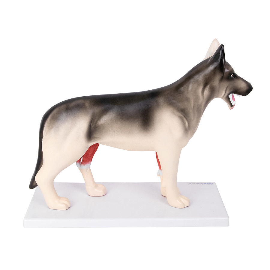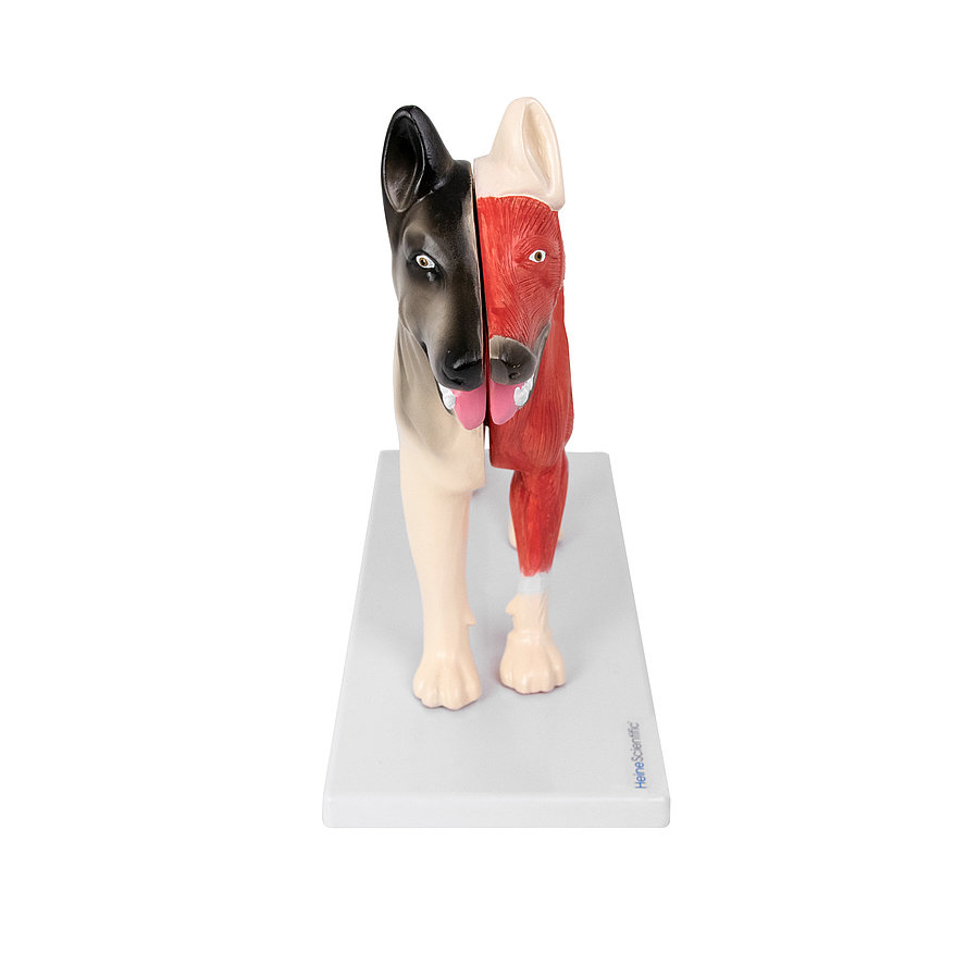Dieses anatomische Hundemodell ist in 2 Hälften gegliedert, von der die eine Hälfte den Hund lebensnah als Komplettansicht mit aufgemaltem Fell darstellt, während die andere Hälfte die Muskeln und Sehnen des Hundes veranschaulicht.