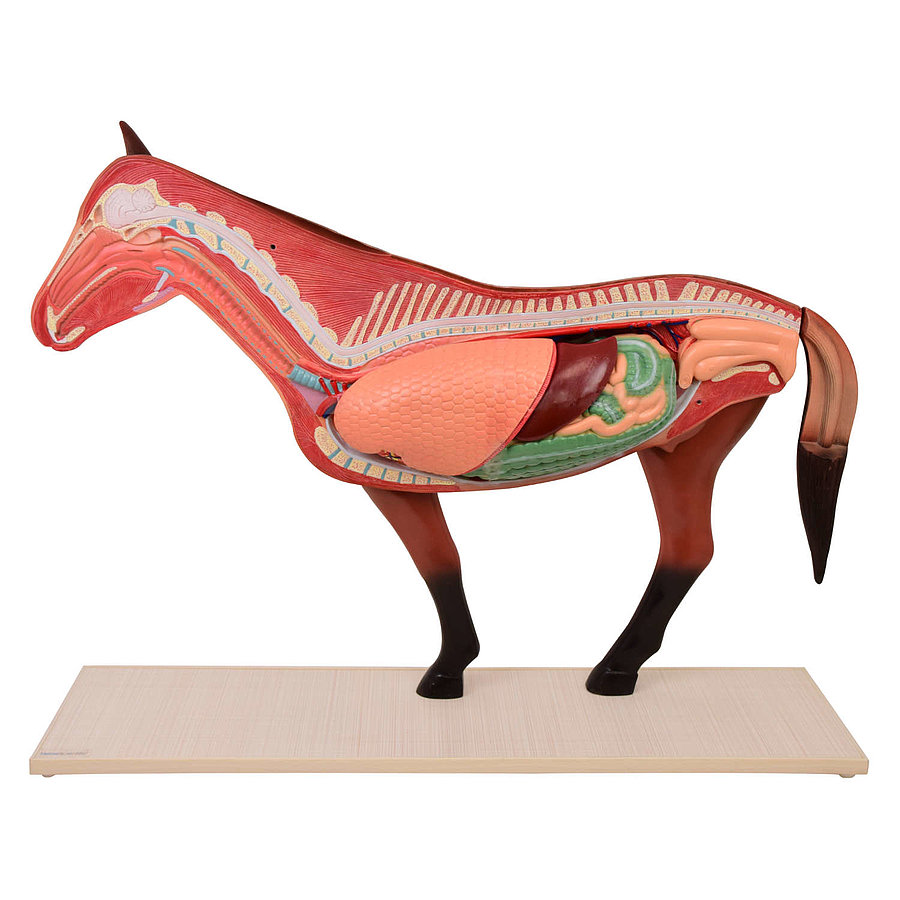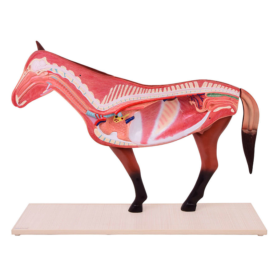Dieses zerlegbare Pferdemodell zeigt sowohl Muskel- und Sehnenstrukturen, als auch die inneren Organe des Tieres. Einzelne Organe können entnommen und teils geöffnet werden, sodass deren Funktionsweise und Aufbau deutlich wird. Der komplexe Verdauungstrakt des Pferdes ist übersichtlich dargestellt und ermöglicht so auf Patientenbesitzern ein nachvollziehen der anatomischen Gegebenheiten. Die Entstehung und Behandlung von Erkrankungen, wie Koliken oder Milz-Nierenband-Verlagerungen, können mithilfe des Modells anschaulich erläutert werden.