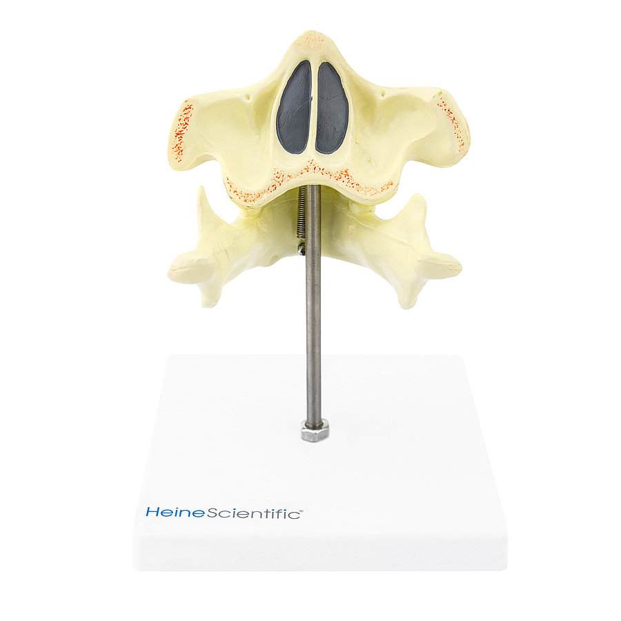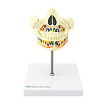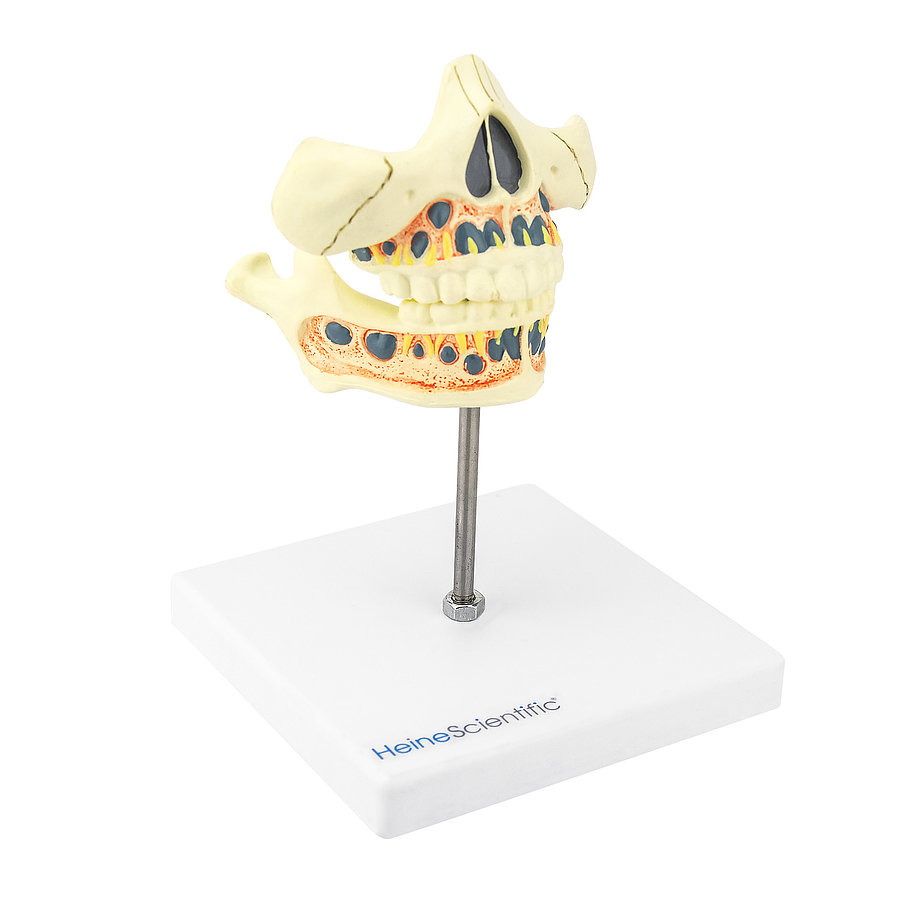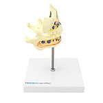 This movable human dentition model shows the upper and lower jaw with a detailed representation of the skeletal structures, nerves and blood vessels. Since the upper and lower jaws are connected with a flexible metal spring, the model can be opened to demonstrate chewing motions and bite anomalies. The jaw model is available in various versions: deciduous dentition with 20 teeth or permanent dentition with 32 teeth.