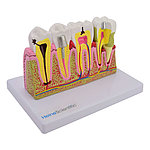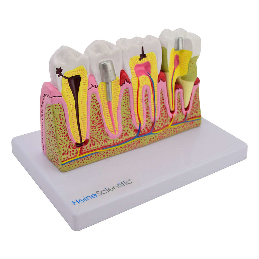 The model with diseased molars is a longitudinal view of various dental ailments and potential treatments. The deeper lying structures, blood vessels and nerves are represented in detail. Diseases, like cavities, gingivitis and periodontitis, can also be visually explained.