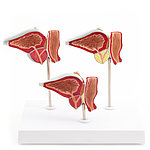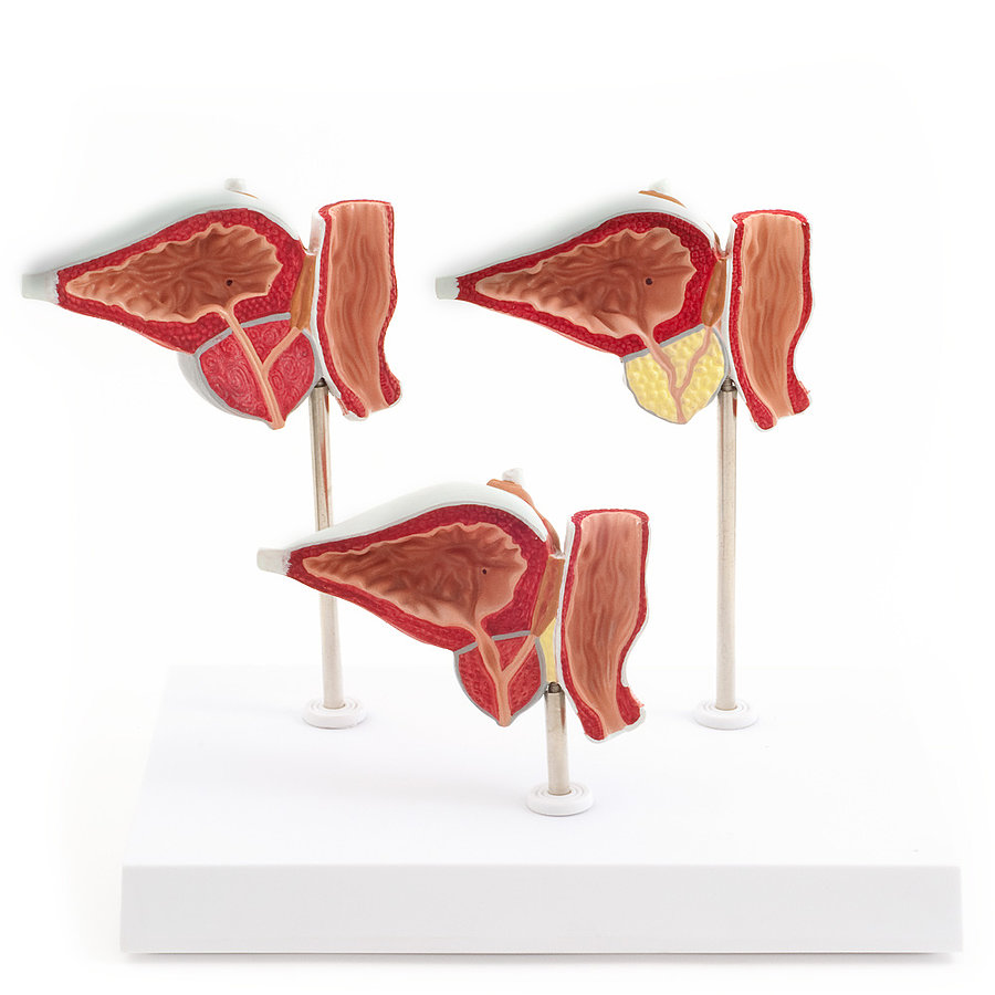 The 3-part prostate model from HeineScientific shows a normal, healthy prostate and, for comparison, two diseased prostates–one with hyperplasia and one with cancerous glandular tissue. The models also show the rectum and bladder to give a clear representation of the anatomy of the prostate.