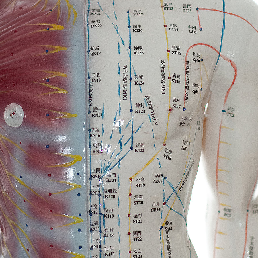 - One side displays the human skin with the meridian zones and acupuncture points,