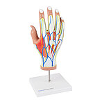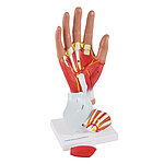 4-part hand model for visualising the human hand and its underlying structures, such as vessels, nerves, tendons and muscles. Three components are detachable and can be viewed separately. The model is securely mounted on a stand with a sturdy white plastic base.