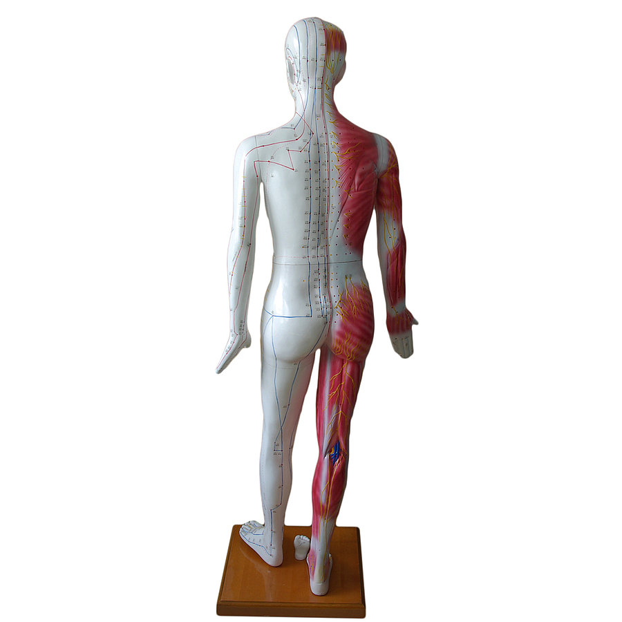- The male acupuncture model is divided into two parts: one half of the body shows skin, the other half of the body shows muscles and sinews.