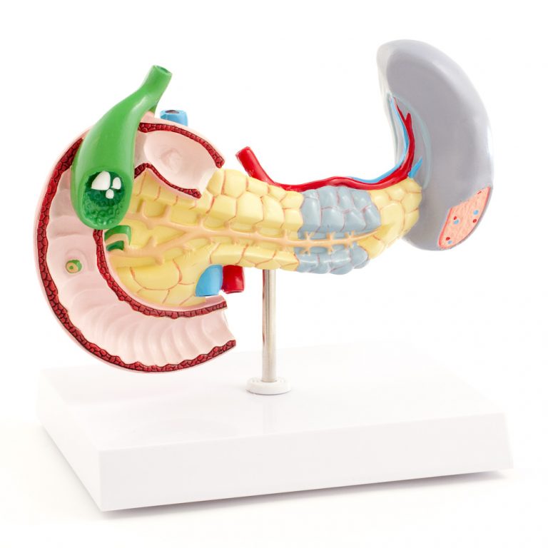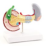 This anatomical model shows a life-size representation of a diseased human pancreas, gallbladder, spleen and duodenum system with four typical diseases of these organs.