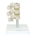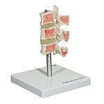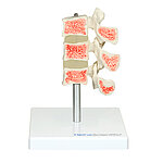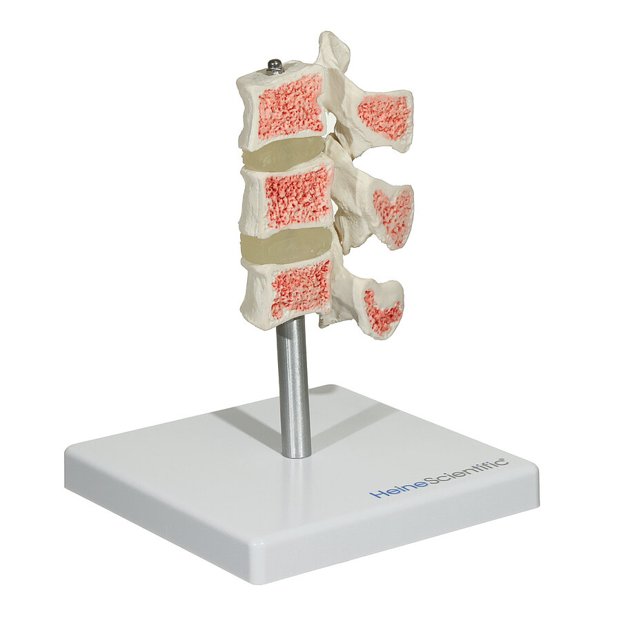 This osteoporosis model consists of three vertebrae cut in the median plane with intervertebral discs. The cut surface of the upper vertebra shows a healthy bone structure, while the median plane shows an osteoporotic bone structure. The lower vertebra shows advanced osteoporosis with depressed top and base plates, also known as "fish vertebrae". The osteoporotic vertebral bones have a markedly reduced density. The osteoporosis model is mounted on a sturdy base and the individual vertebrae can be removed from the stand for detailed viewing.