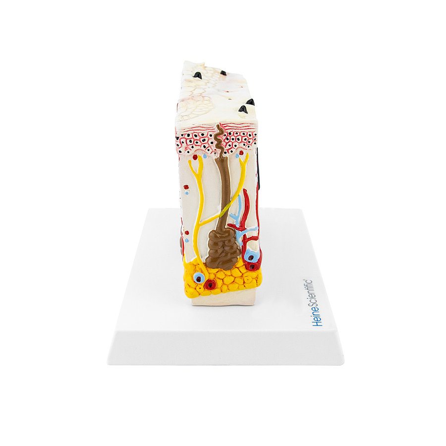 This psoriasis model is a block model of the skin which shows the physiological structure of the skin as well as the effects of psoriasis on the individual skin layers.
