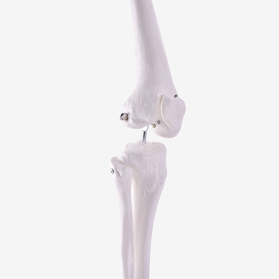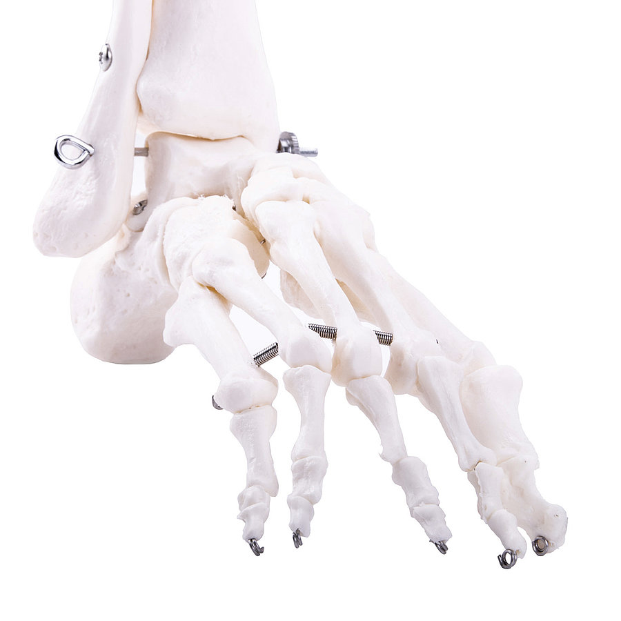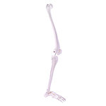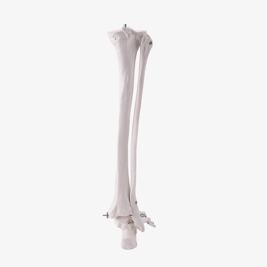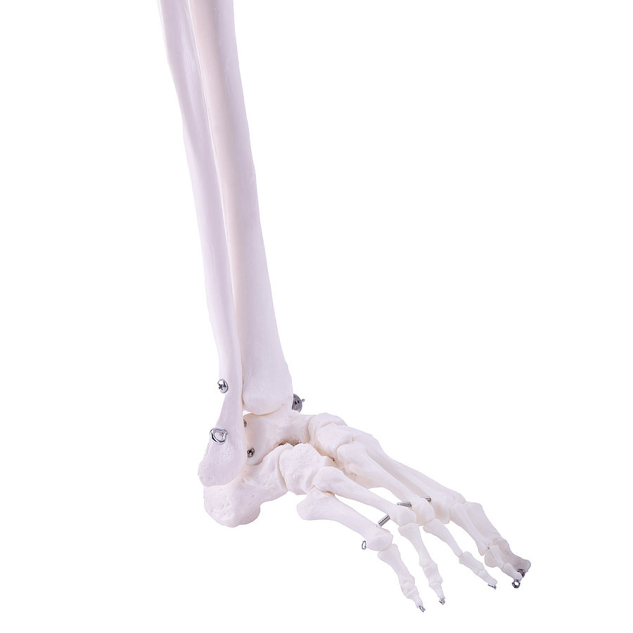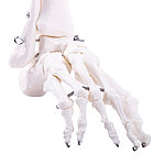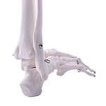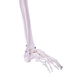 The skeleton model of a human leg shows the bony structure of the foot, lower leg and thigh. The life-size anatomical model can be partially disassembled.