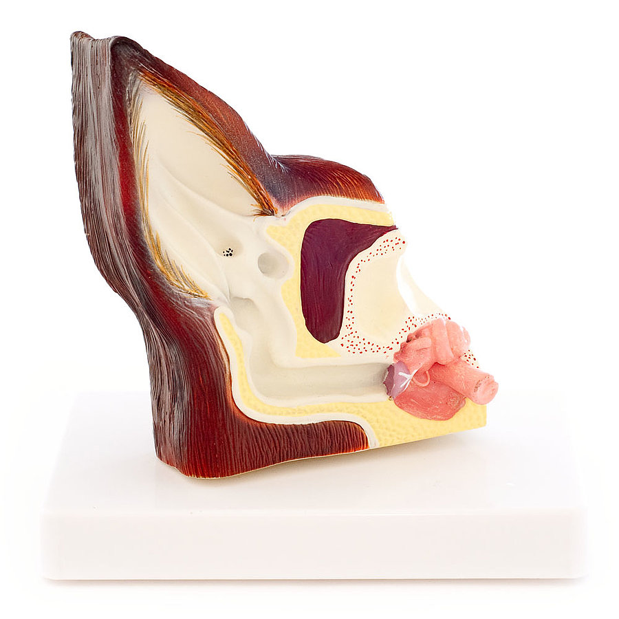 - The canine ear model comes mounted on a white base
