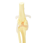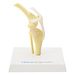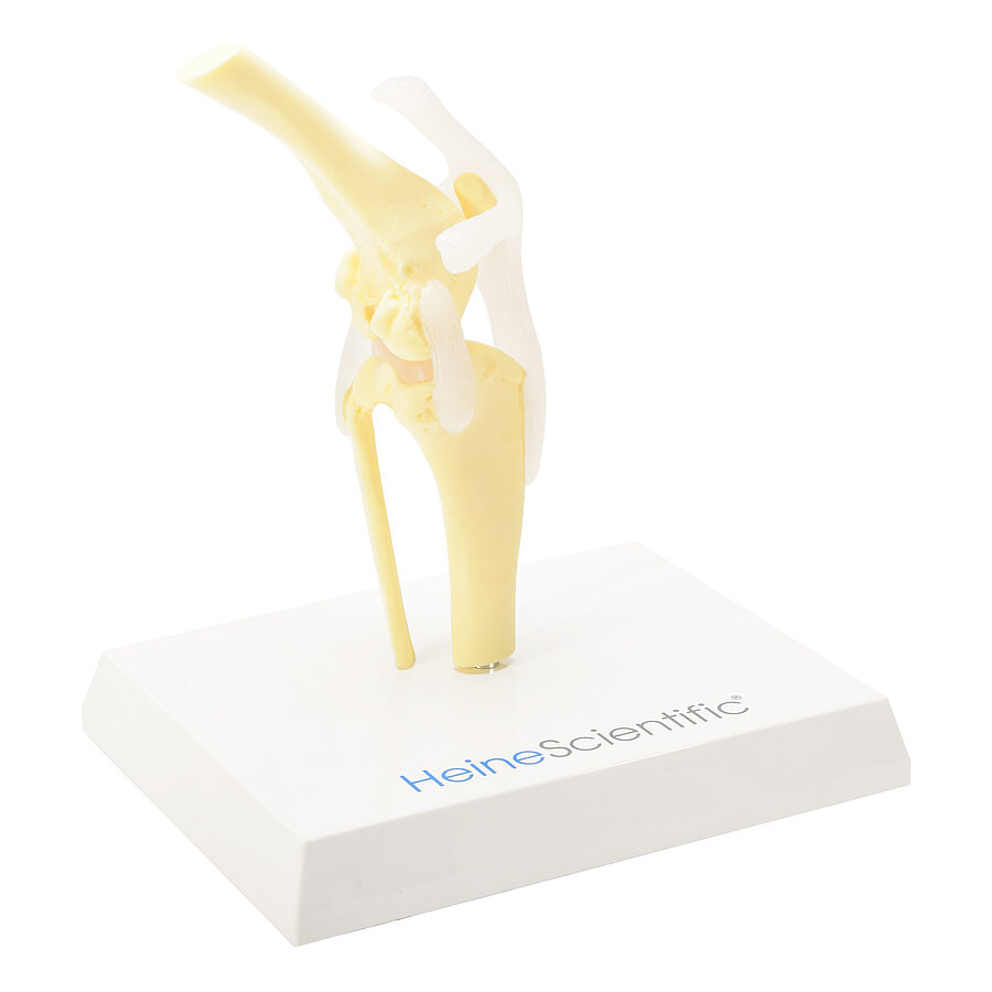 This rigid anatomical model represents the knee joint of a medium-sized dog, displaying the ligamentous apparatus. This canine knee joint model measures 5 x 9 x 18 cm and comes mounted on a white plastic base. It is excellent for explaining anatomical connections and for discussing therapy concepts.