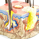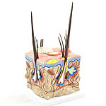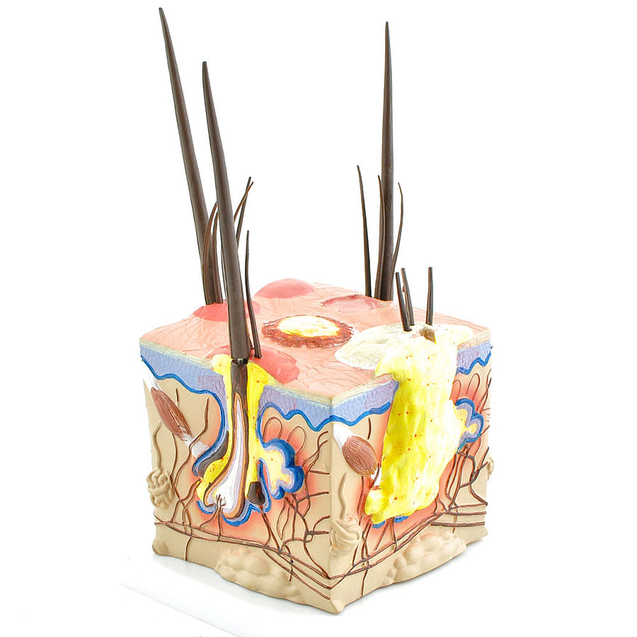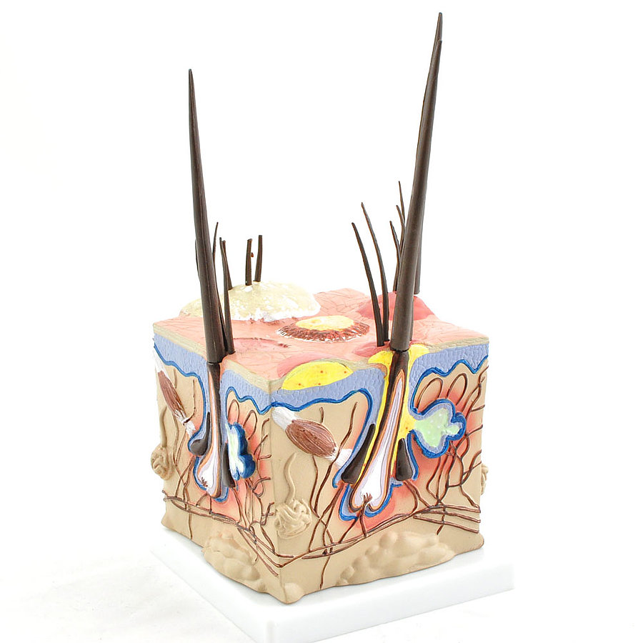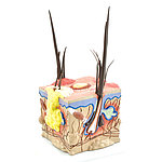 The anatomical model of canine skin diseases shows the anatomical structures of the skin as well as various changes and diseases in vivid detail. The model is in the shape of a block and features removable hairs, meaning that it is very clear and of high quality.